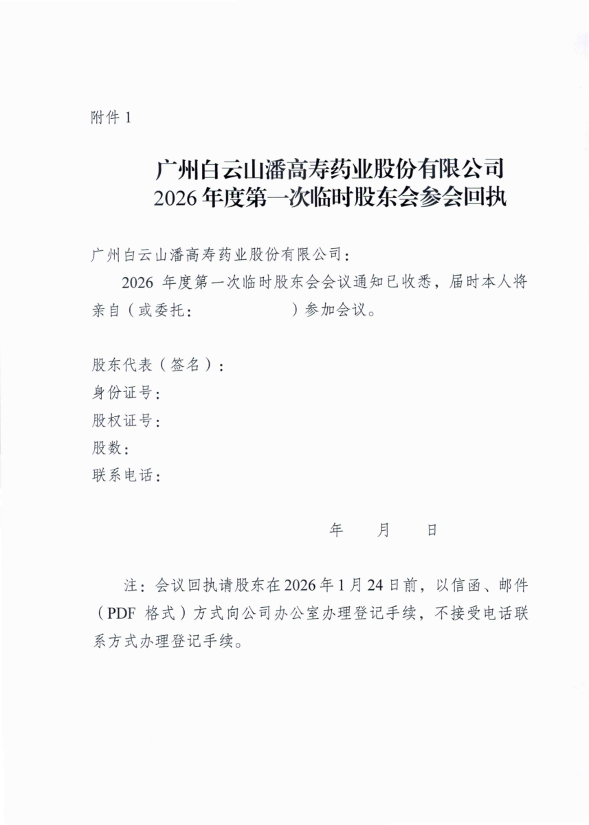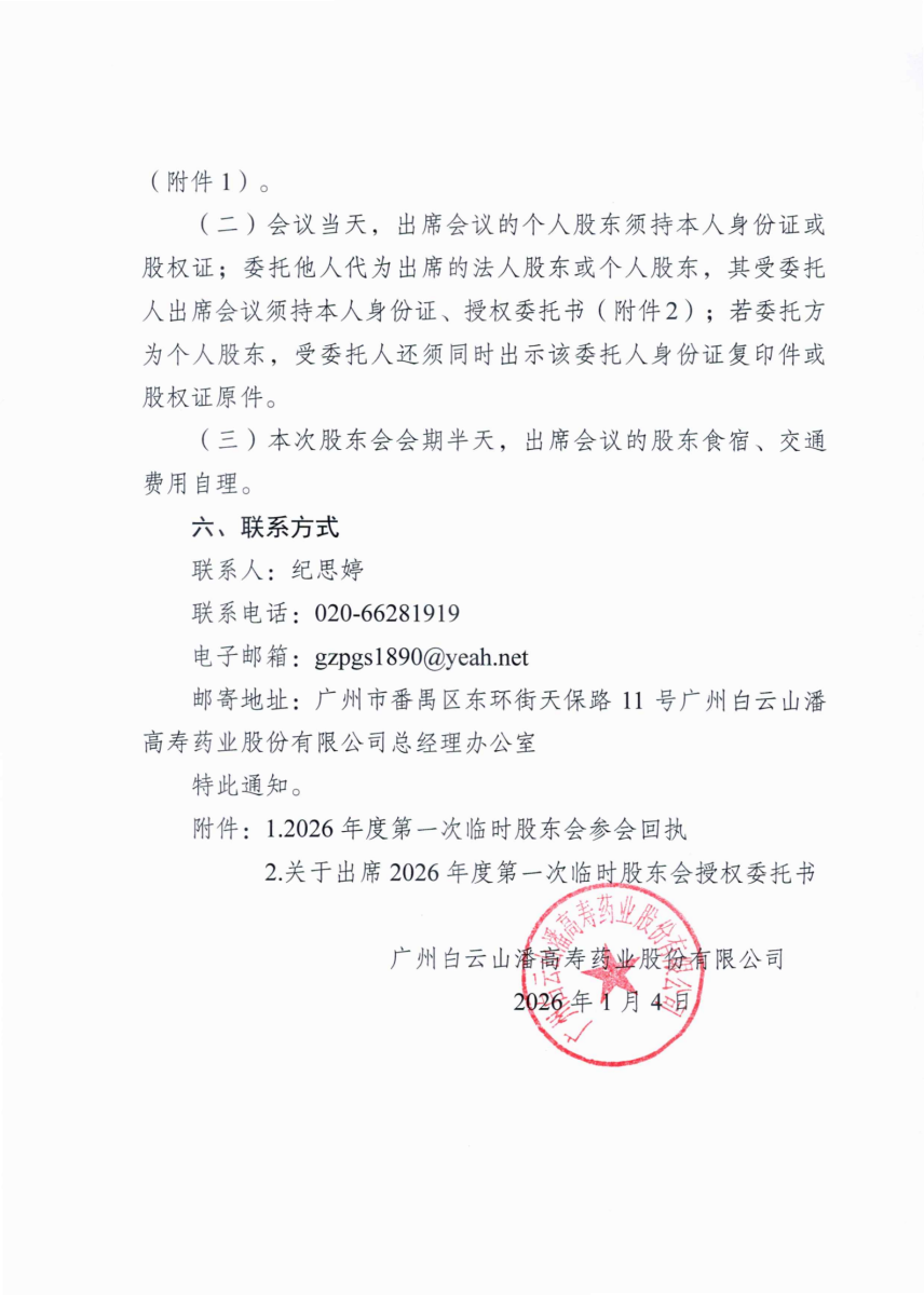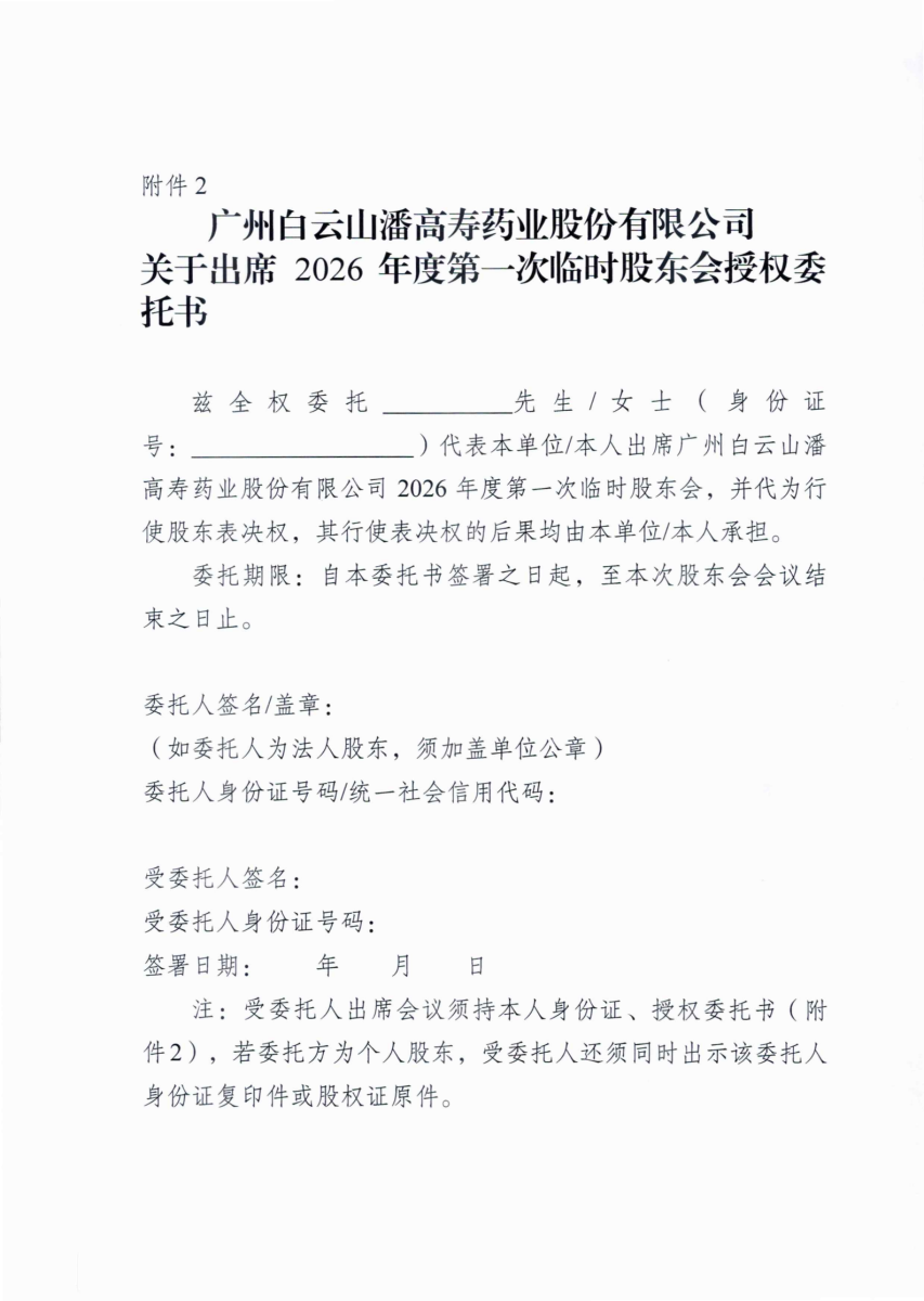 廣州白云山潘高壽藥業股份有限公司關于召開2026年度第一次臨時股東會的通知